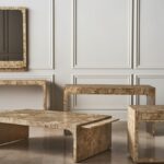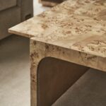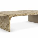 Classic in form and material, this multifunctional cocktail table makes an organic yet glamorous statement. Crafted from exotic mappa burl veneers, intricately pieced to showcase its highly figured, swirling grain. A Brazen bronze leaf finish underneath adds warm contrast and a soft glow. Features two pull-out trays on either end to extend the top surface when entertaining guests.