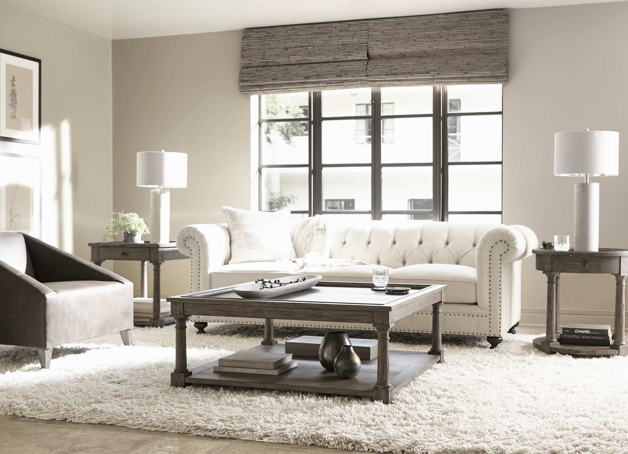 The Canyon Ridge round side table blends casual style with a touch of formality, giving a traditional design a modern farmhouse feel. Crafted from radiata pine solids with yellow pine veneers, the table features gallery molding around a recessed top. Four Doric leg posts connect to a fixed bottom shelf, creating a classic, structured look. A wire-brushed Desert Taupe finish adds warmth to the pine veneers, enhancing depth and variations in the wood grain.