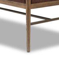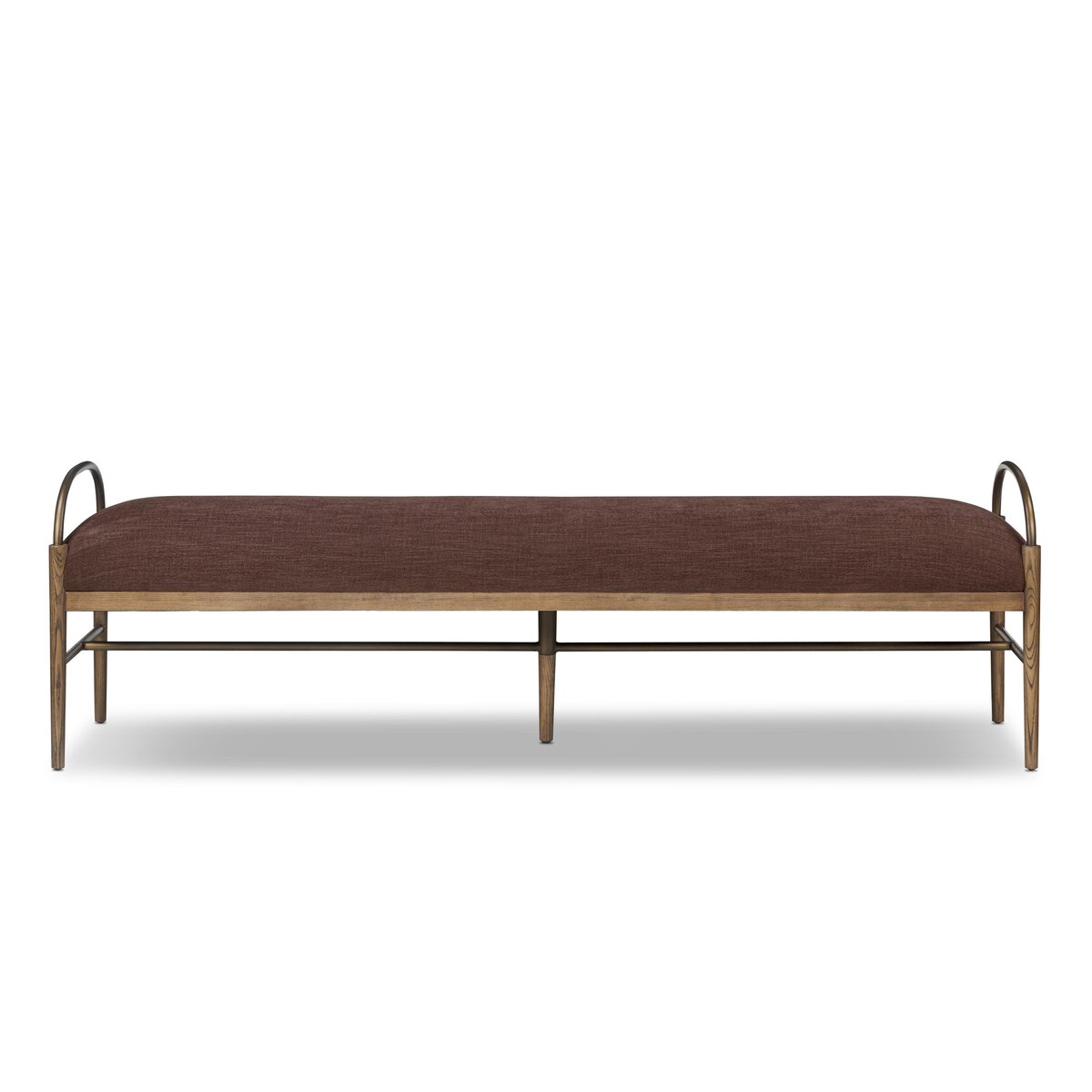 Curved brushed iron arms and an H-shaped stretcher pair with amber ash legs for a distinct material blend. Rich plum-hued upholstery provides a tactile contrast and warm, inviting feel. A design collaboration by Amber Lewis and Four Hands. This item has limited online distribution and may not be sold on websites without prior approval.