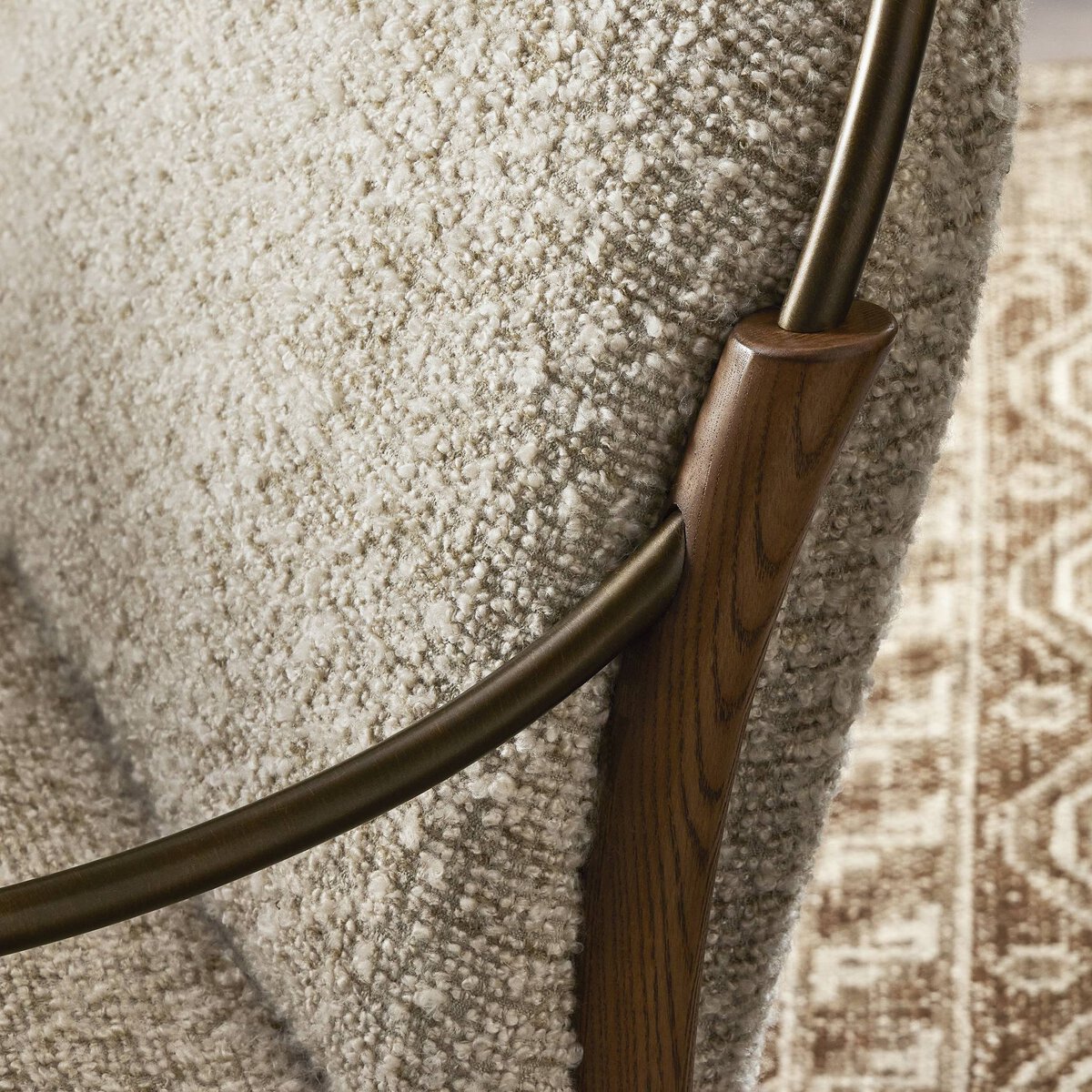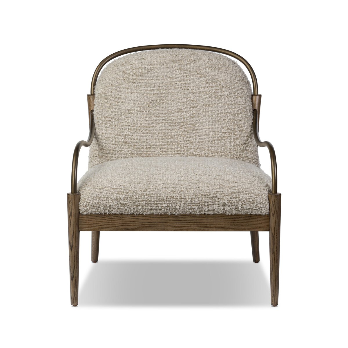 A tribute to traditional artistry and found pieces, this updated accent chair silhouette fluidly combines ash and burnished brass to frame a comfortable S-spring seat. Finished in heavy boucle-like upholstery that features a subtle linear pattern for added depth — creating a luxe, inviting feel.