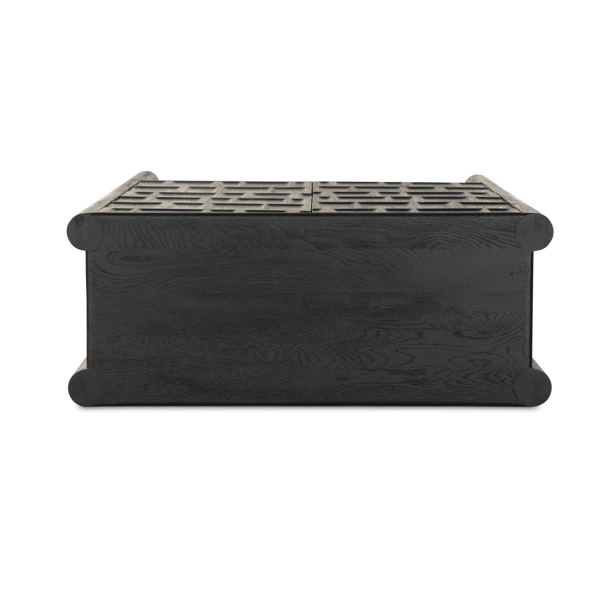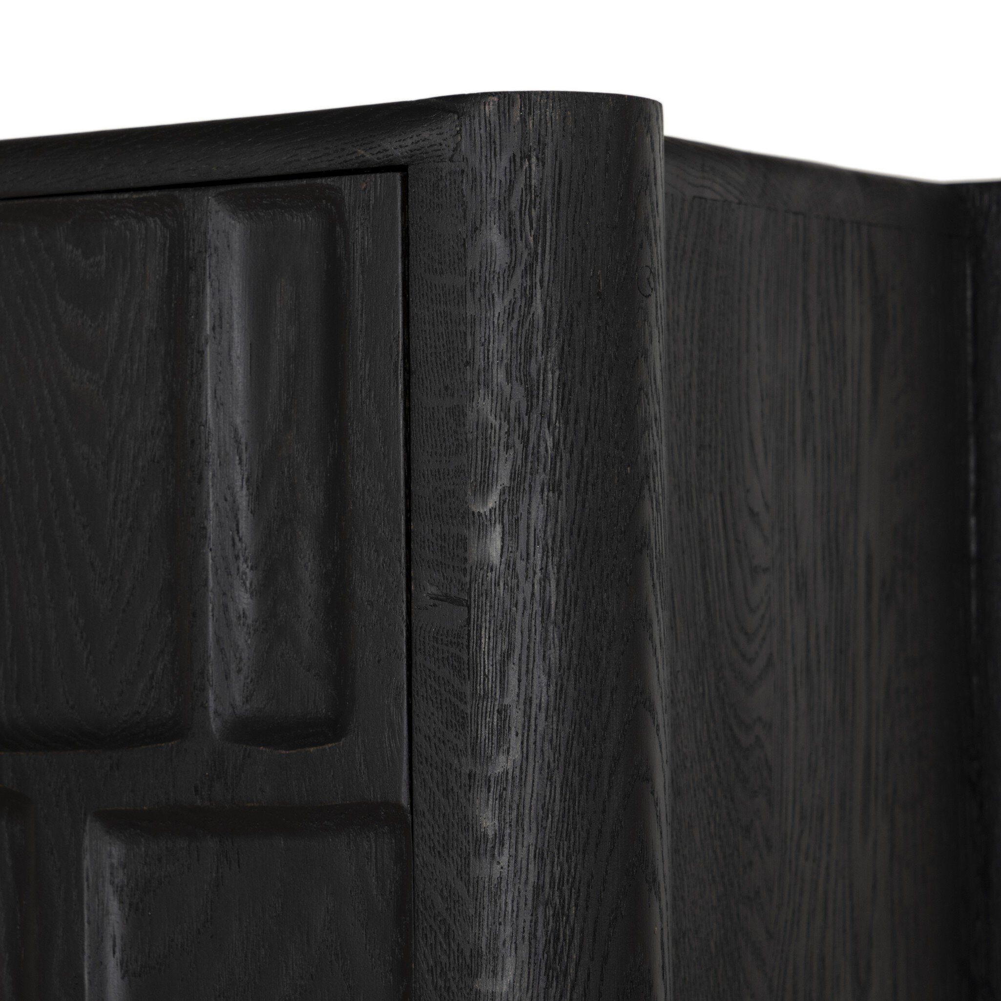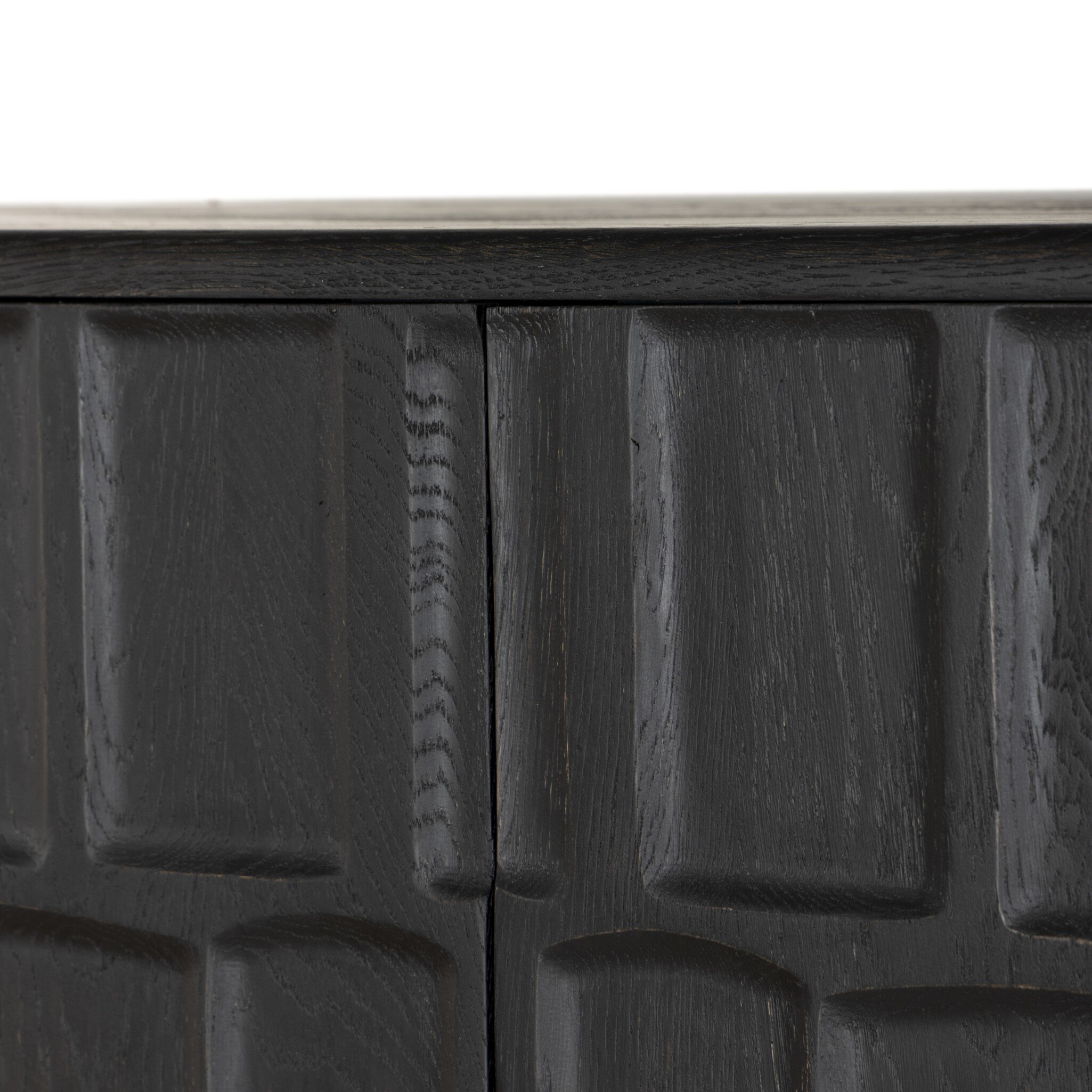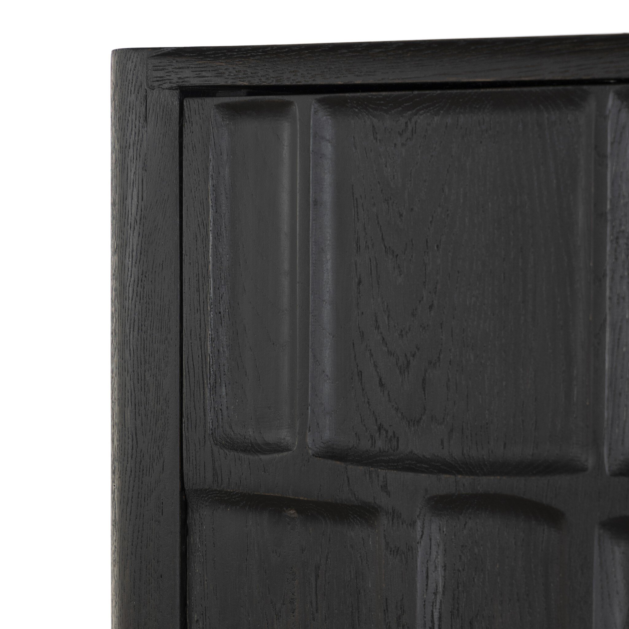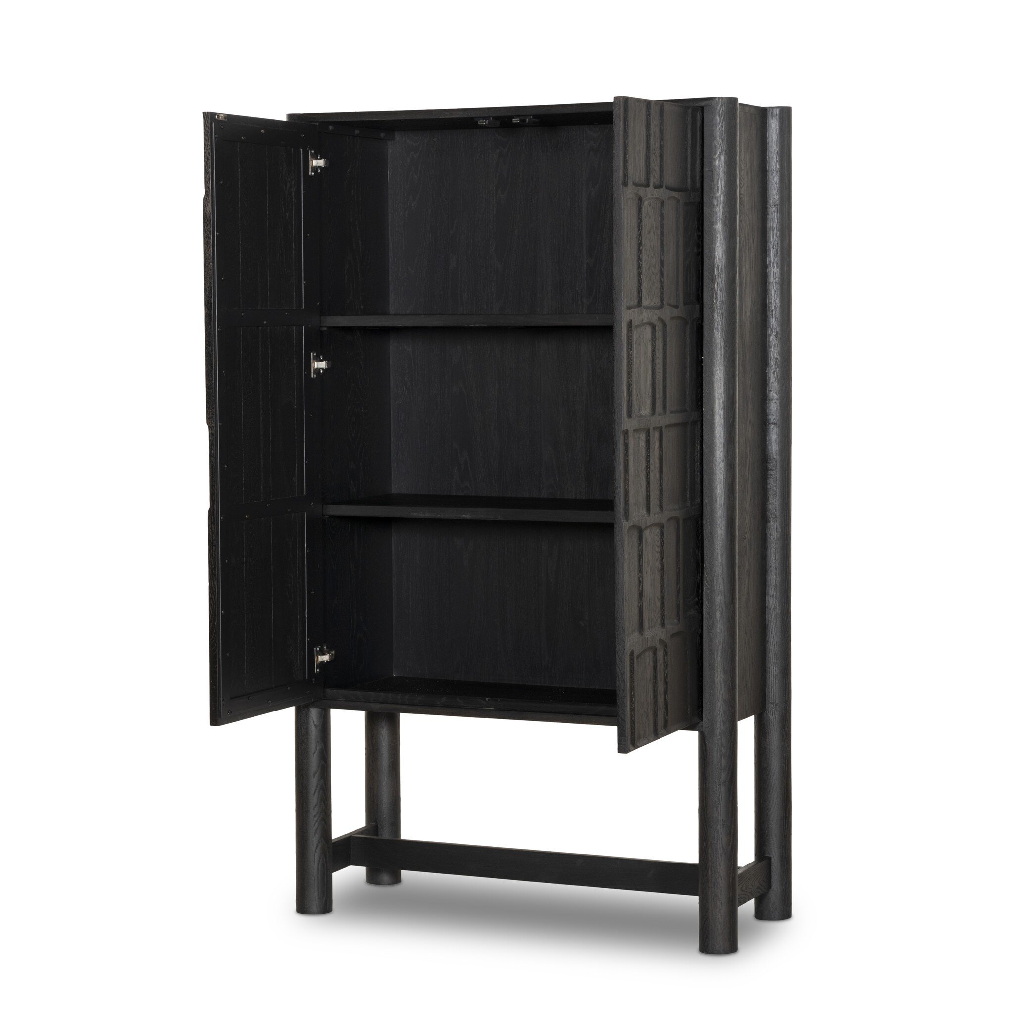 Made from solid oak and finished in a classic black, tall cabinetry is carved with a unique grid-like pattern, for an organic look and textural touch. Interior shelving offers bonus storage to any room. Subtle variations in natural wood graining to be expected.