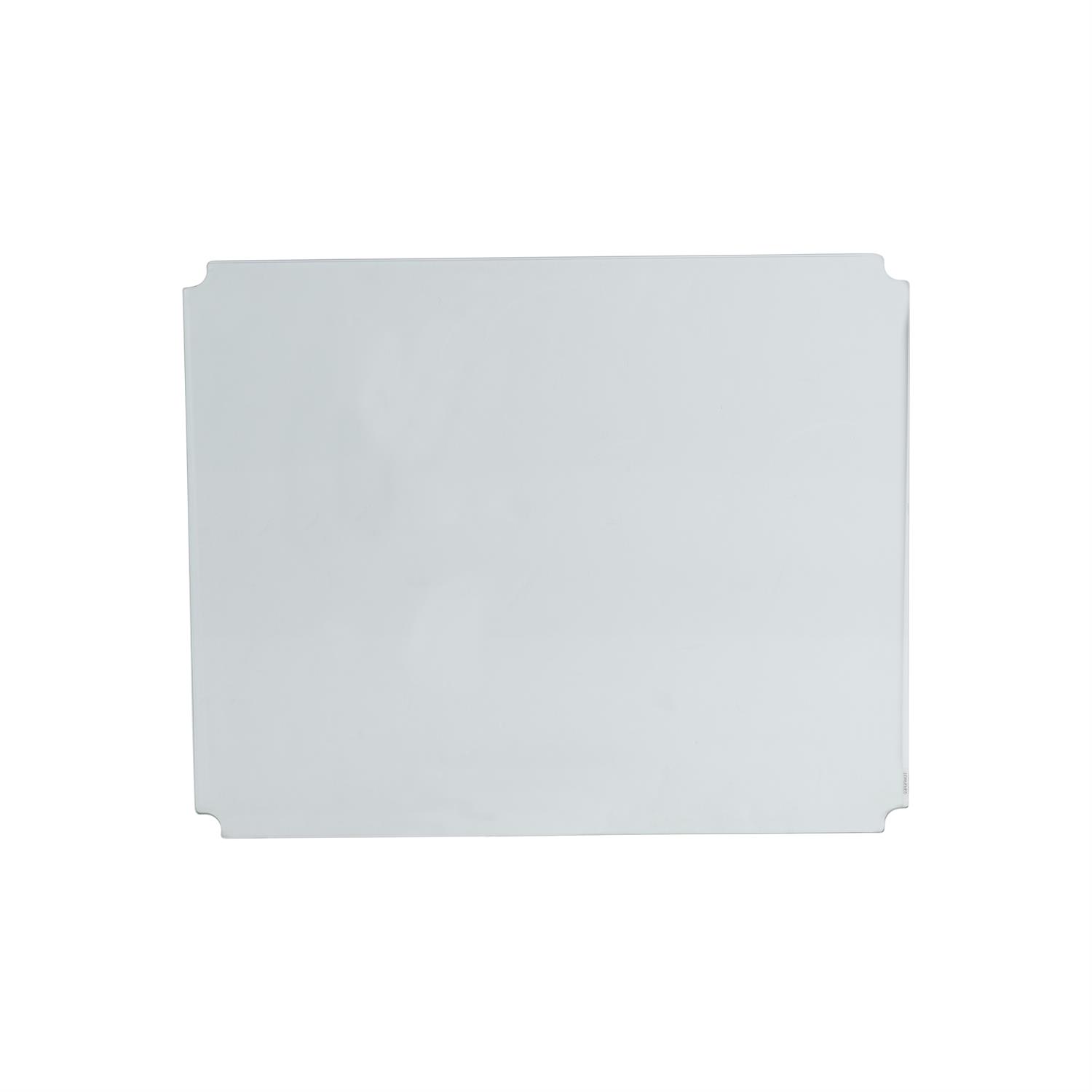 Steel frame in Graphite finish with woven abaca shelf in Light Grey Wash finish and a tempered glass top