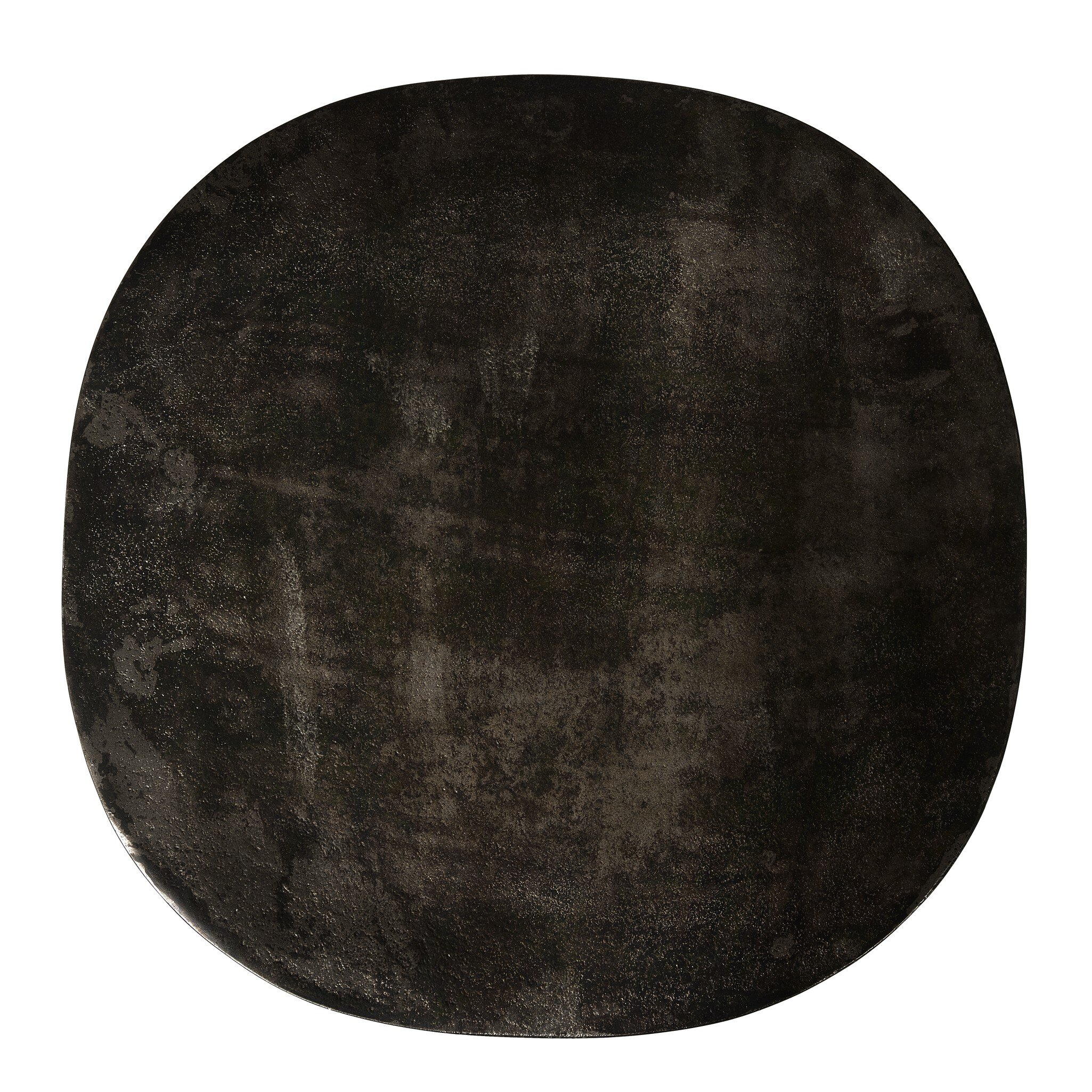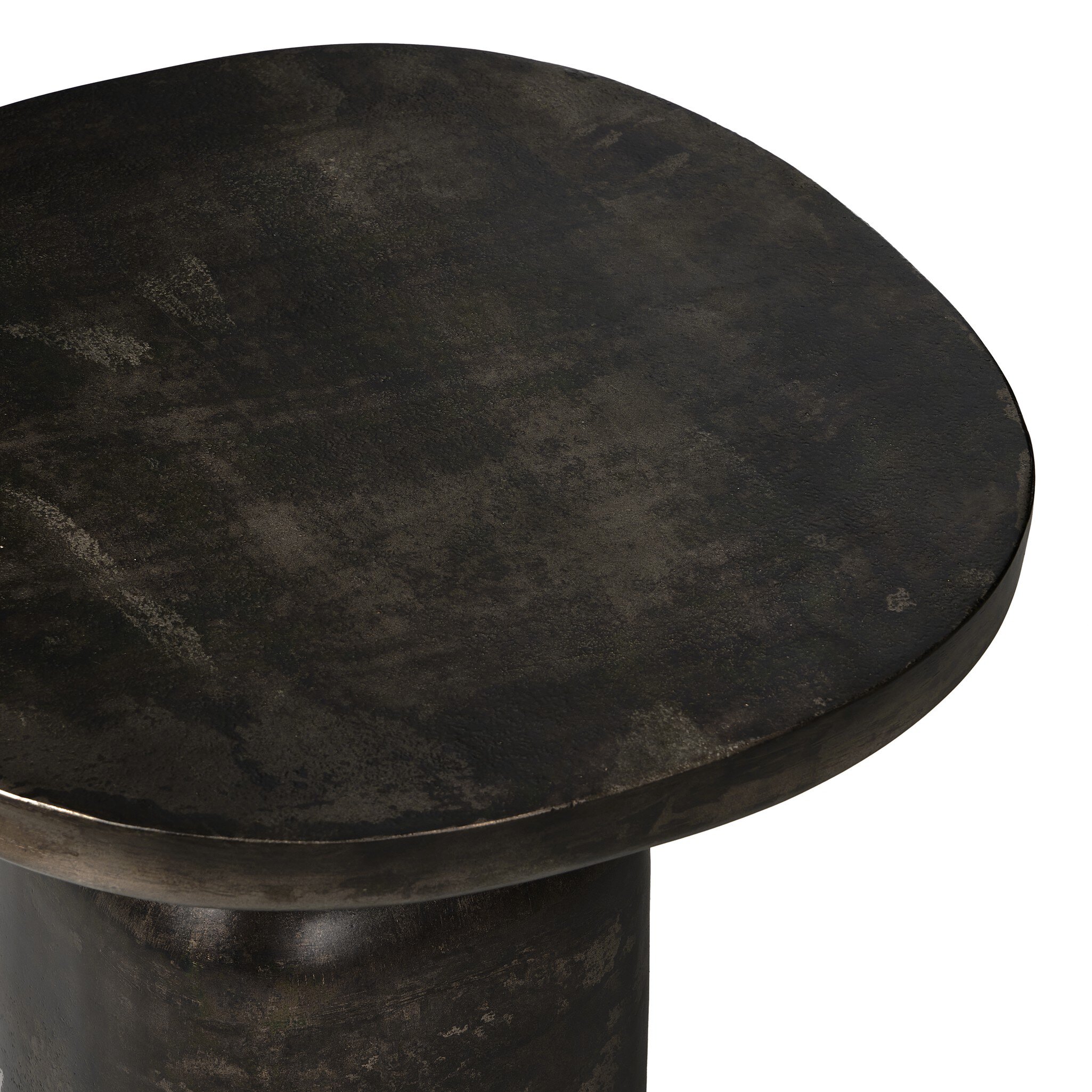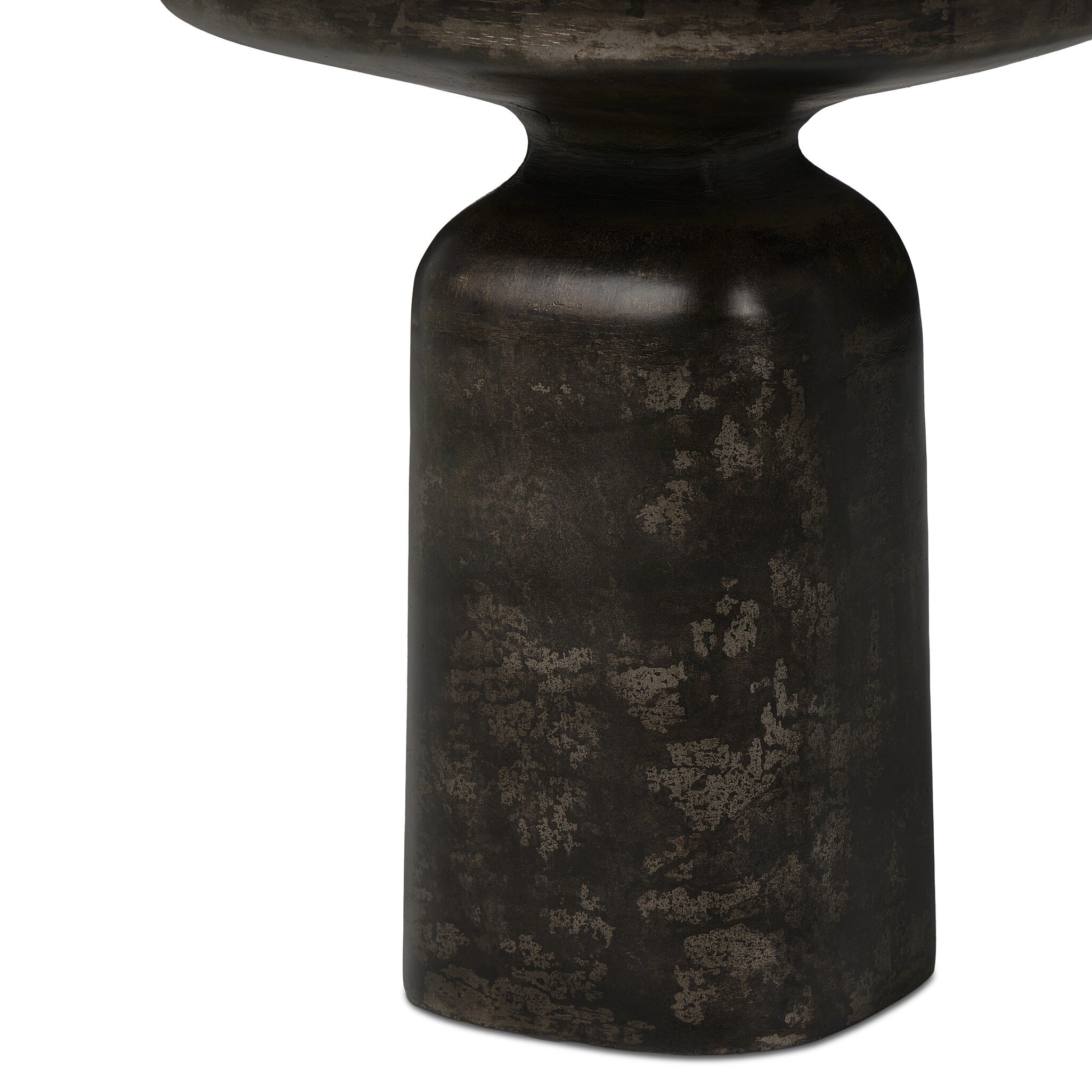 Forged from cast iron with a distressed bronze patina finish. A sturdy pedestal base and rounded square top create a functional, industrial-inspired piece.