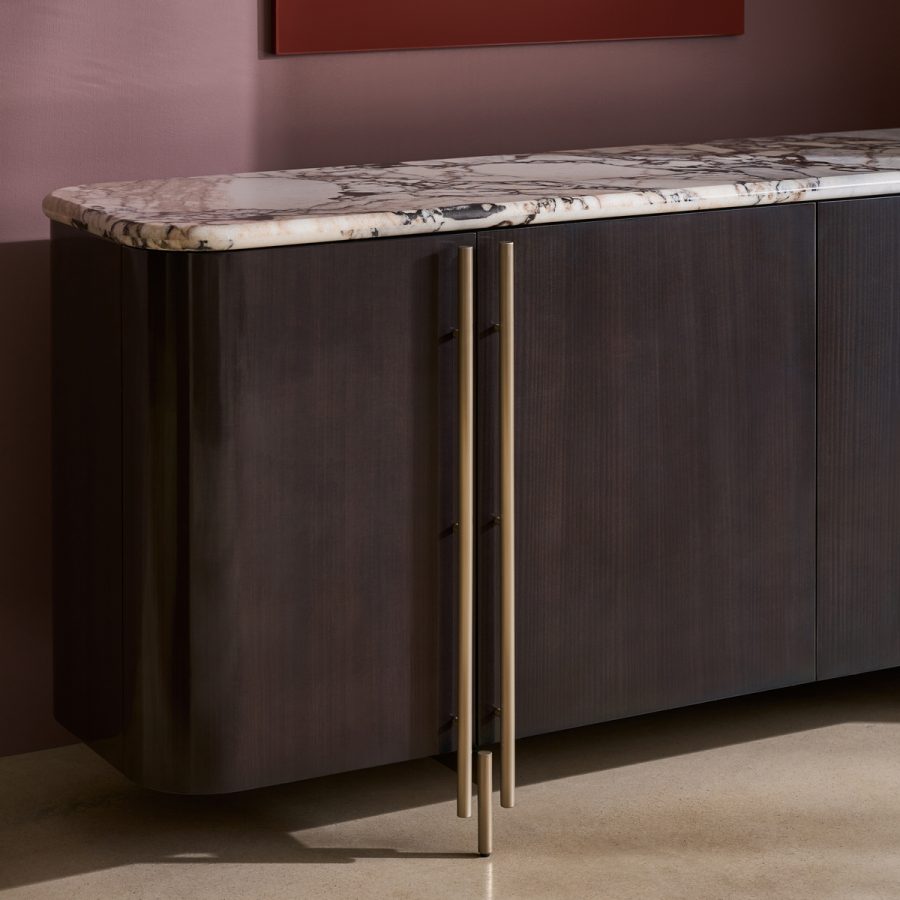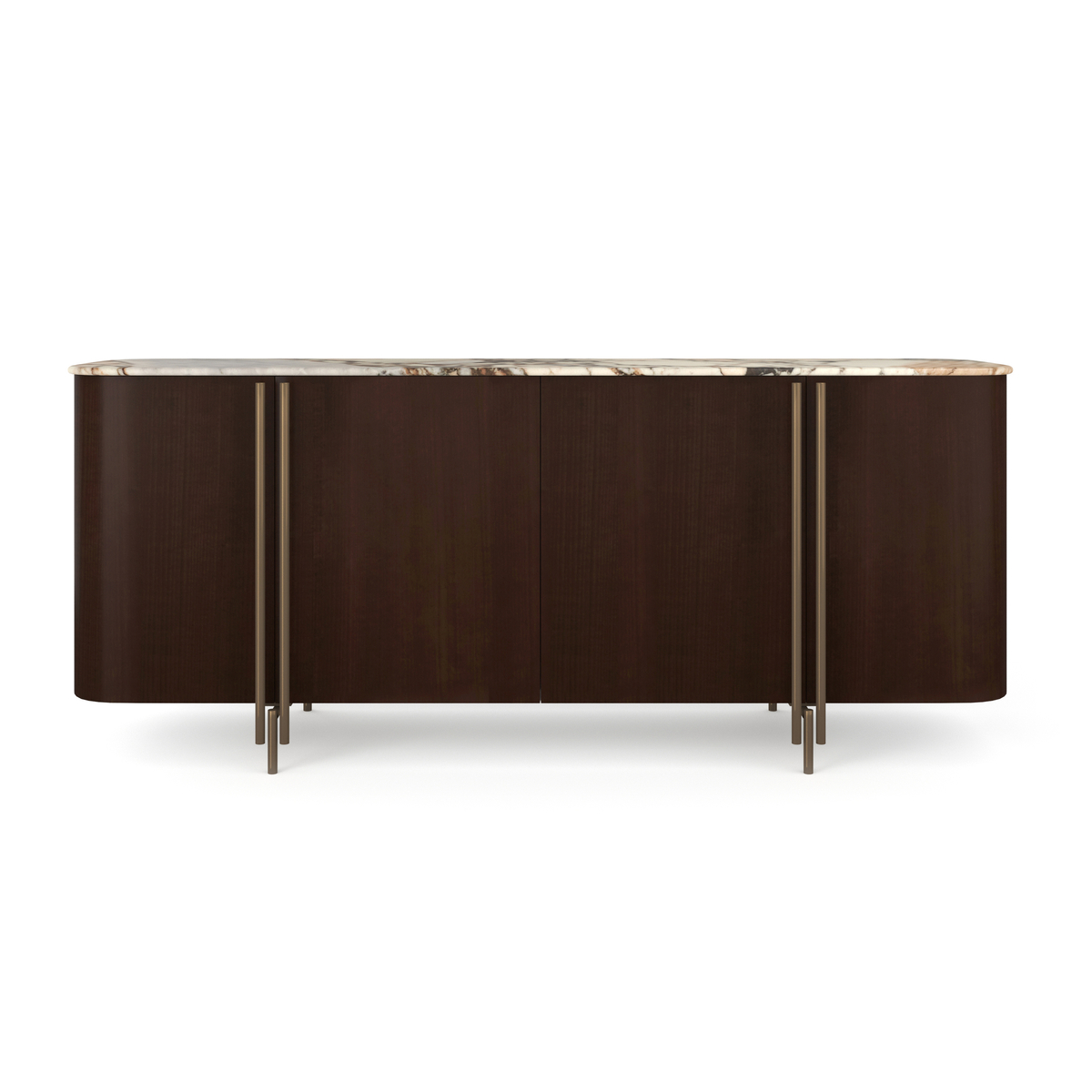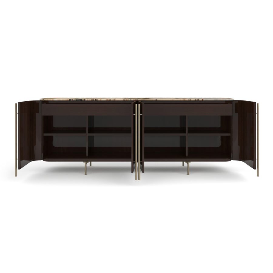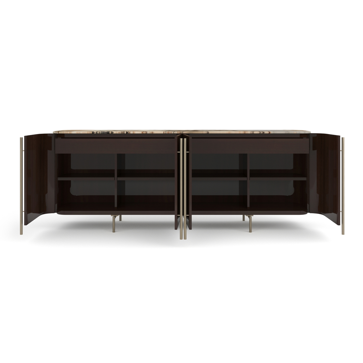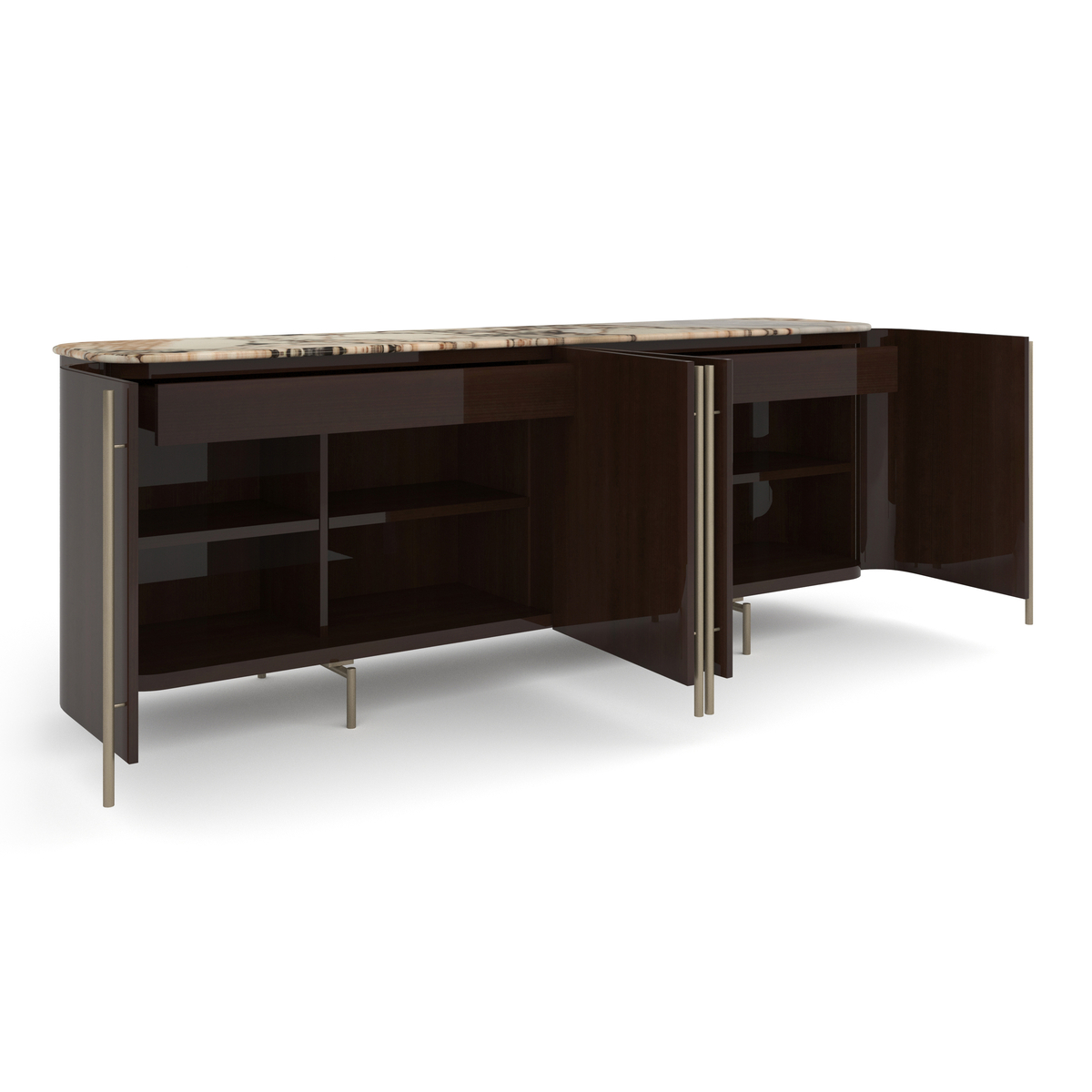 Calcutta Viola stone, with its richly figured veins in plum, burgundy, inky browns and blacks, is the visual centerpiece of this Sideboard. The stunning slab of oval stone rests on a cabinet with bullnose corners of hand-applied Tupelo veneers finished in sultry Otter Gloss. The piece’s metal frame is a series of four, long, slender round rods in Brushed Gold that create a slight Deco feel. The doors’ hardware geometrically intersects with the Brushed Gold feet. The interior, all finished in Otter, has two drawers with bottom finger pulls and two shelves.