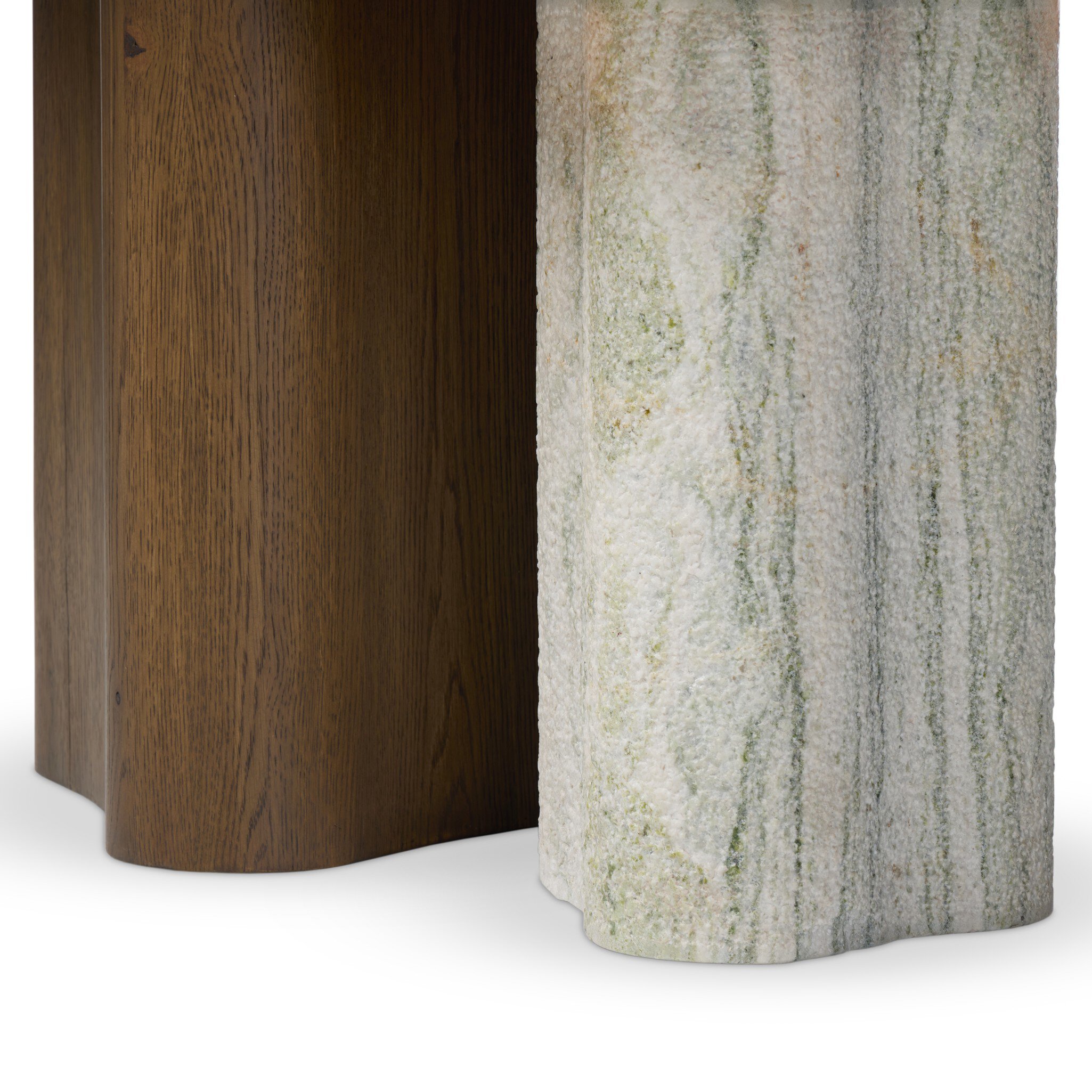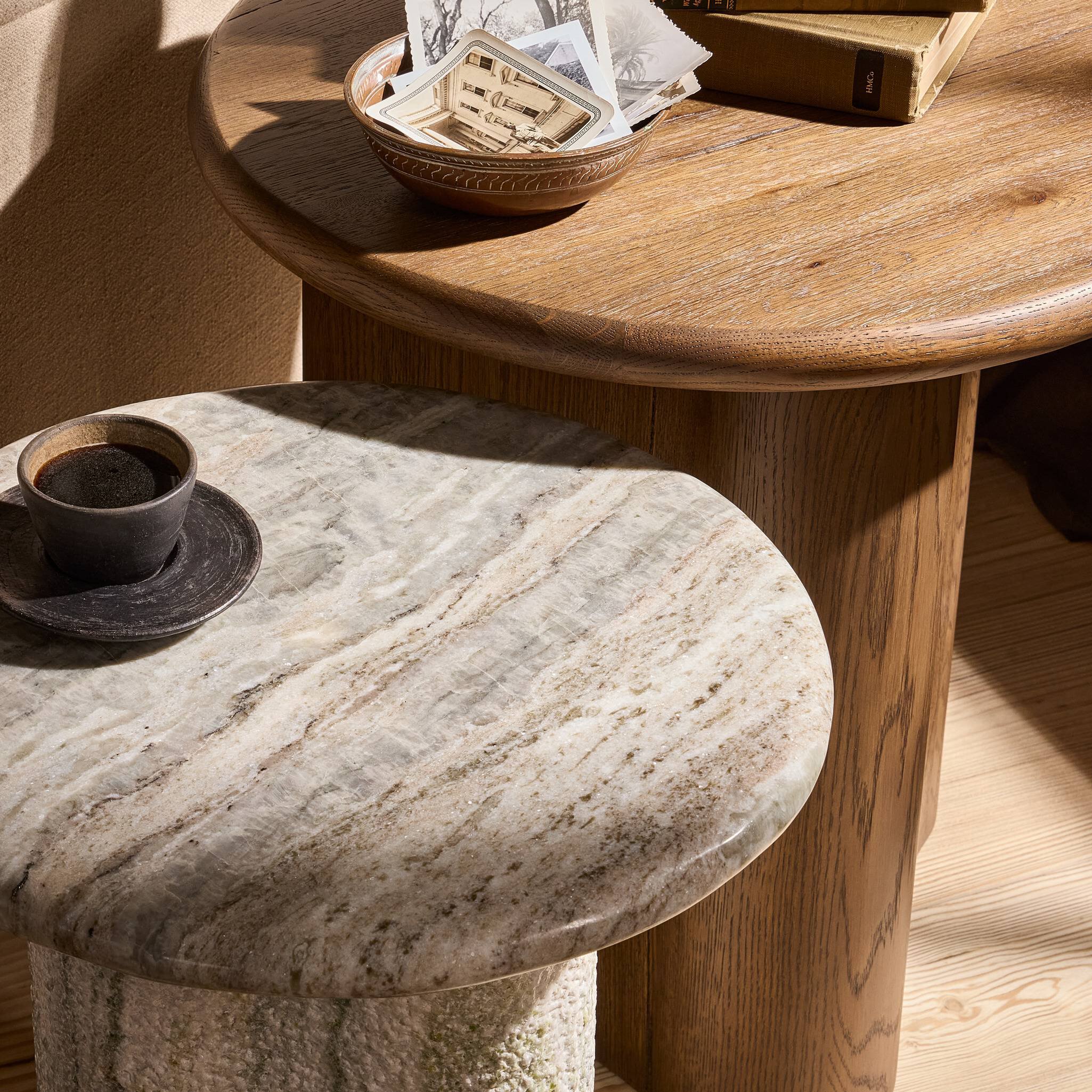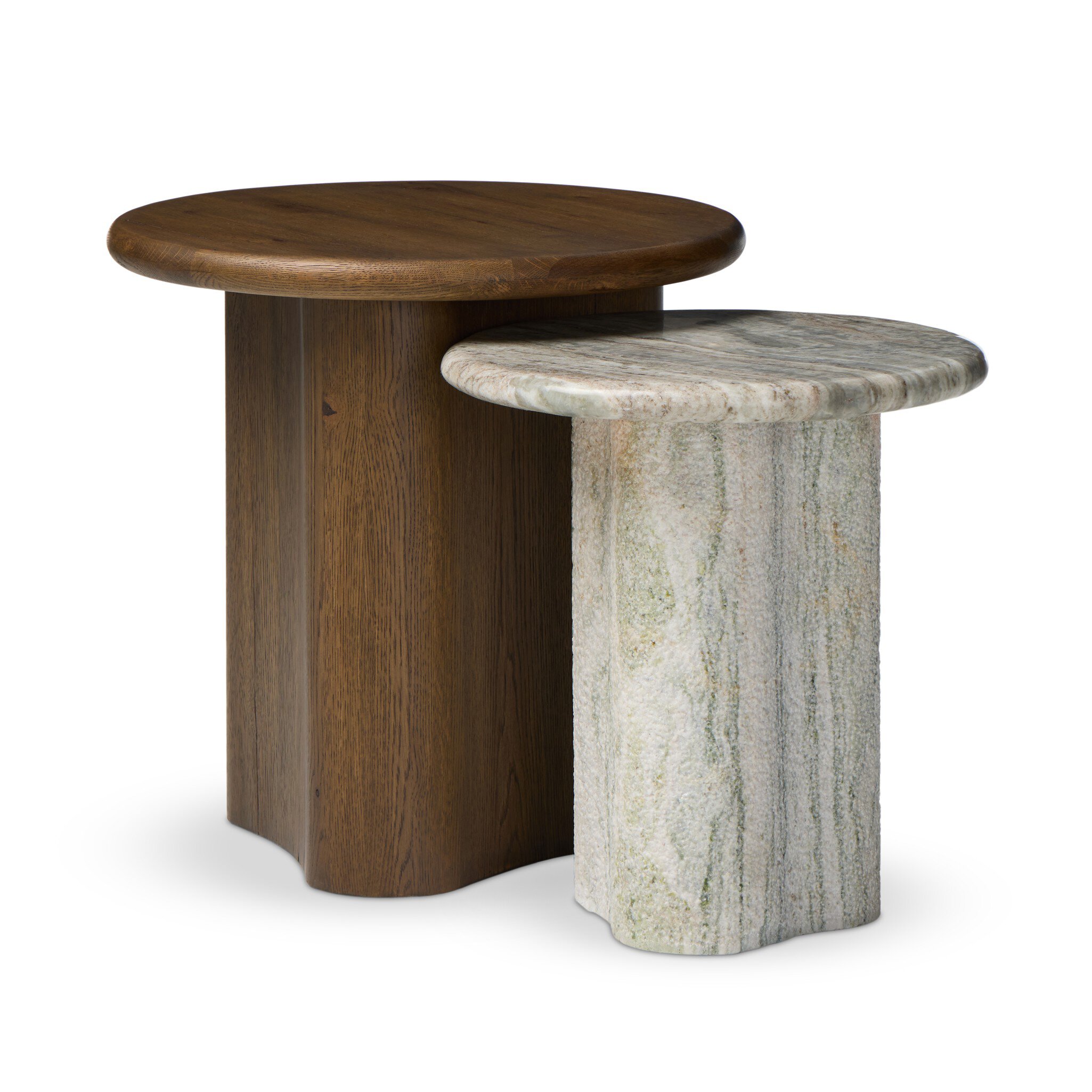 A nested duo of end tables, contrasting in size and material. Wavy bases pair with the round tops, highlighting the subtle character of the warm wood veneer on the larger size. The smaller of the two features textured marble on the base, with the same stone polished smooth on top.