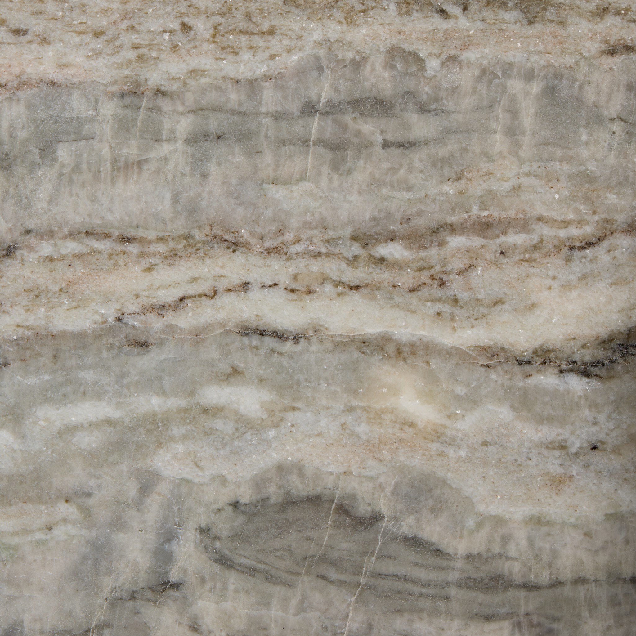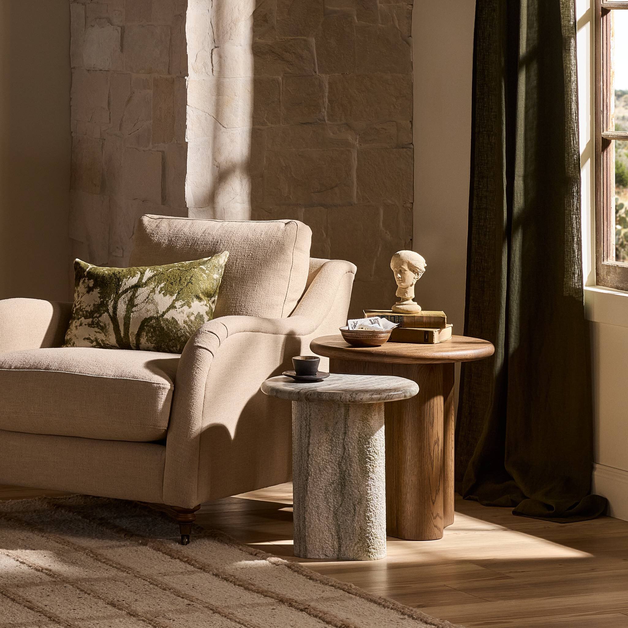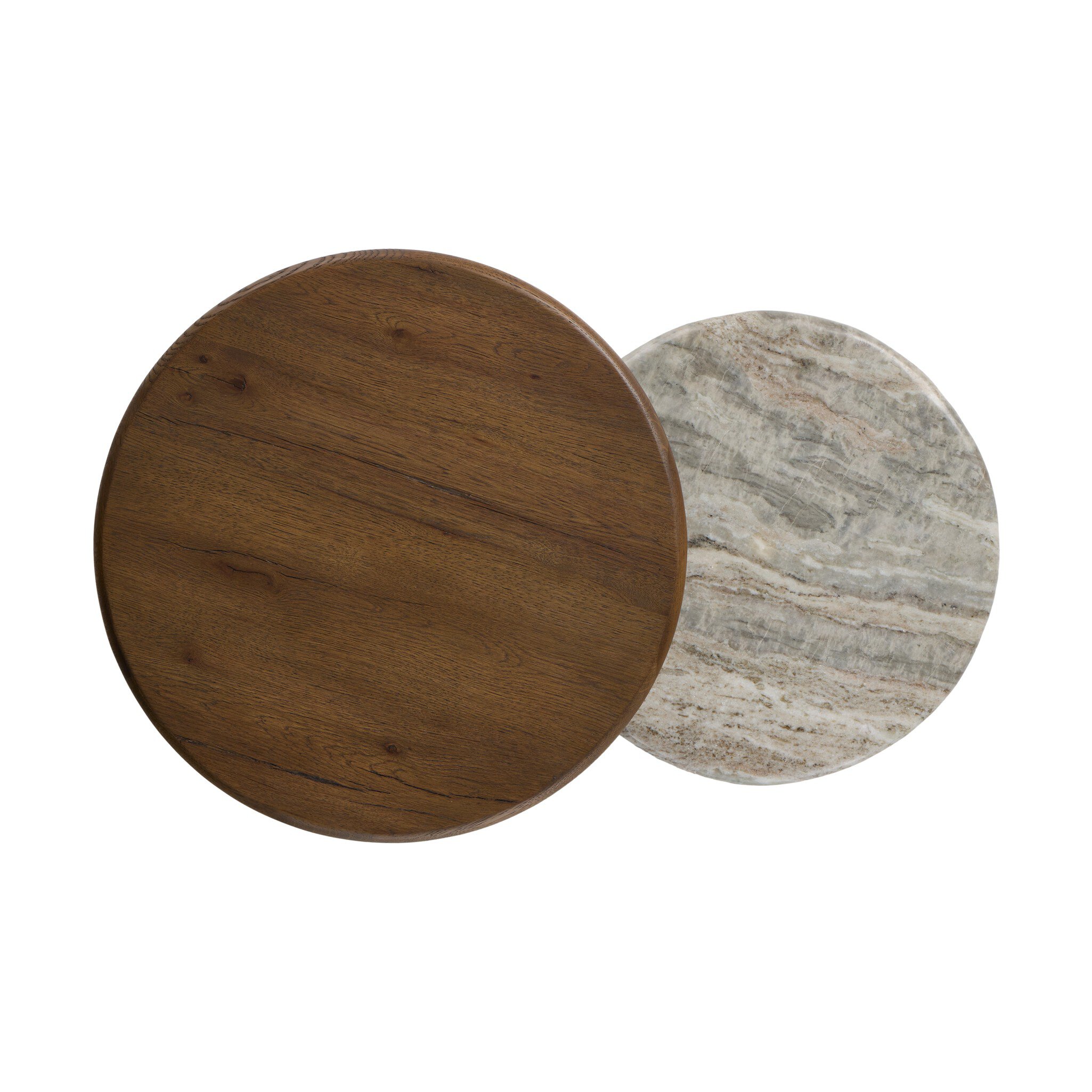 A nested duo of end tables, contrasting in size and material. Wavy bases pair with the round tops, highlighting the subtle character of the warm wood veneer on the larger size. The smaller of the two features textured marble on the base, with the same stone polished smooth on top.