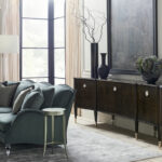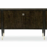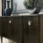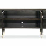 “What’s All The Buzz” becomes readily apparent when you stand in front of this stately console. Figured Maple in a highly polished Dark Roast finish, envelopes the large, immaculately tailored cabinet with a slightly curved front and reeded details throughout. Opening each door is octagonal hardware with a three-dimensional impression of a bee, crafted very much in the style of noted French crystal artists. Two center doors and two end doors each reveal single adjustable shelves and hidden cord access in the back panels. Thin tapered legs are fitted with Whisper of Gold ferrules.