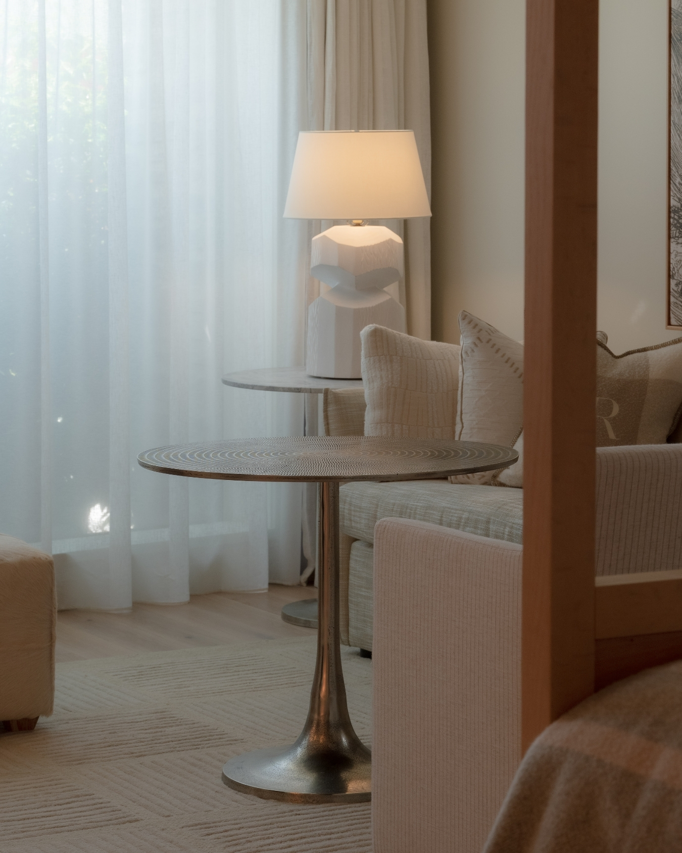 Alongside internationally sourced collections, SR Interiors also developed custom lighting and bespoke side tables specifically for the project. These pieces were produced through SR Interiors’ nearshore manufacturing partners, allowing the design team to carefully tailor materials, finishes, and proportions to complement the interior scheme.