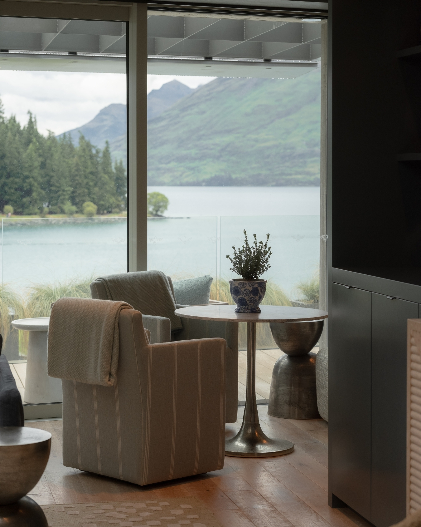 Designed as a tranquil destination where guests can experience the beauty of Queenstown in a refined yet relaxed setting, the interiors bring together natural materials, layered textures, and timeless forms inspired by the surrounding alpine landscape.
