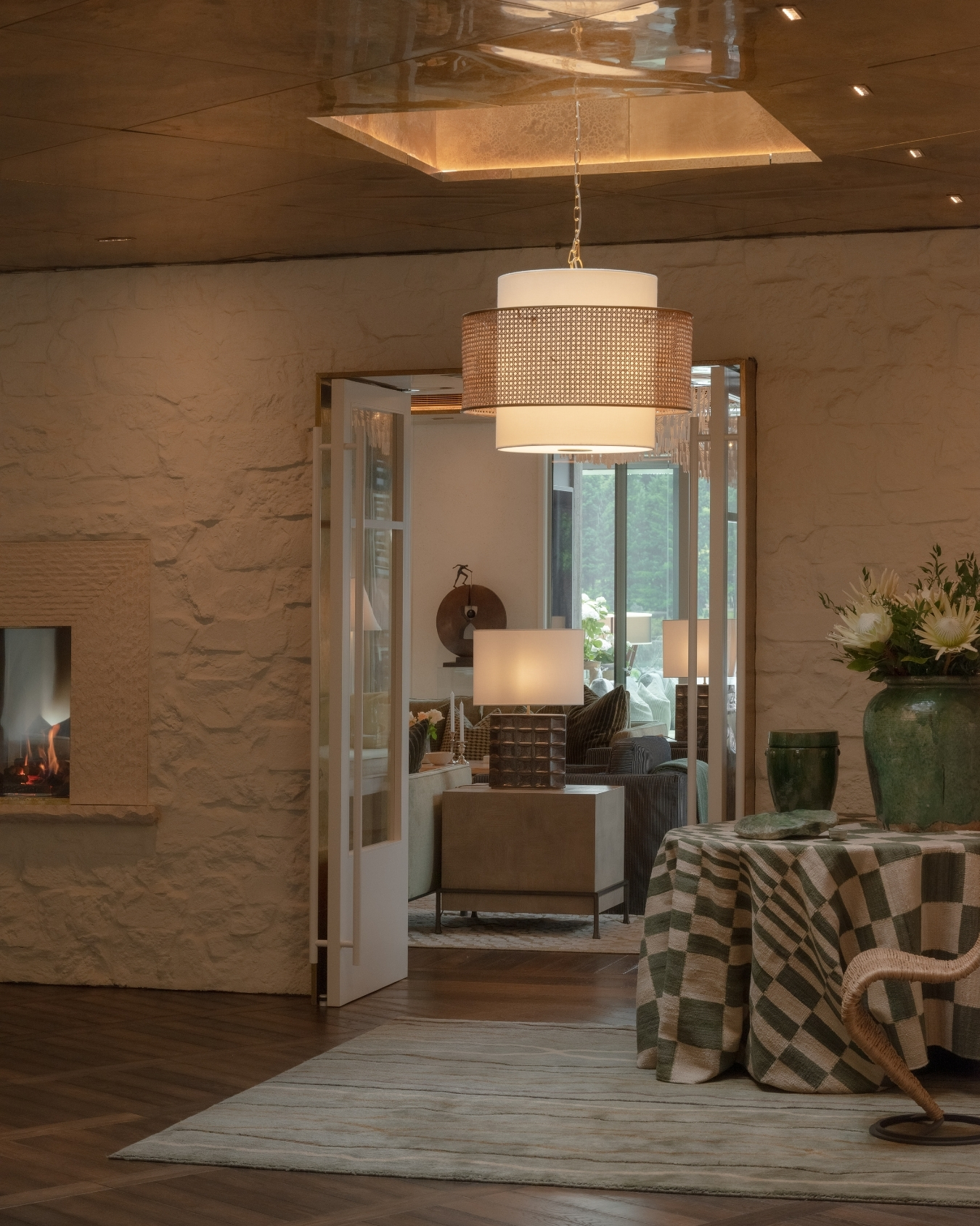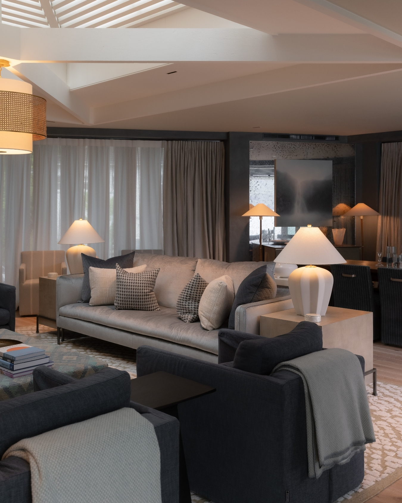 Statement lighting highlights key architectural features, while carefully chosen furnishings create inviting spaces for guests to relax and connect with the surrounding landscape.